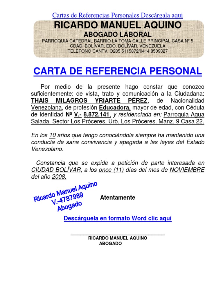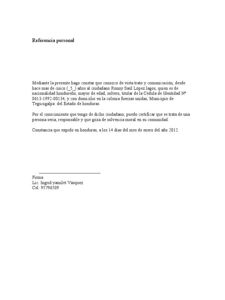 Sin lugar a dudas redactar lo mas minuciosamente y detalldamente posible los datos. Modelo de Carta de Referencia Personal Nro. Las referencias personales son documentos realizados por un particular quien hace una referencia sobre una persona.