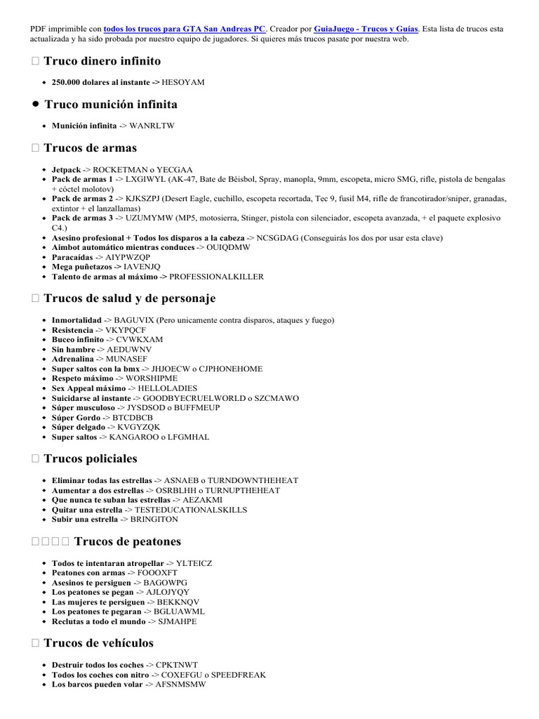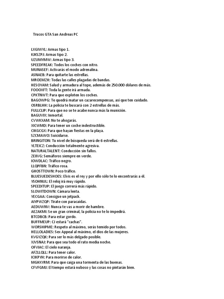 Trucos Gta San Andreas Pc Pdf Ocio Informatica Y Tecnologia De La Informacion