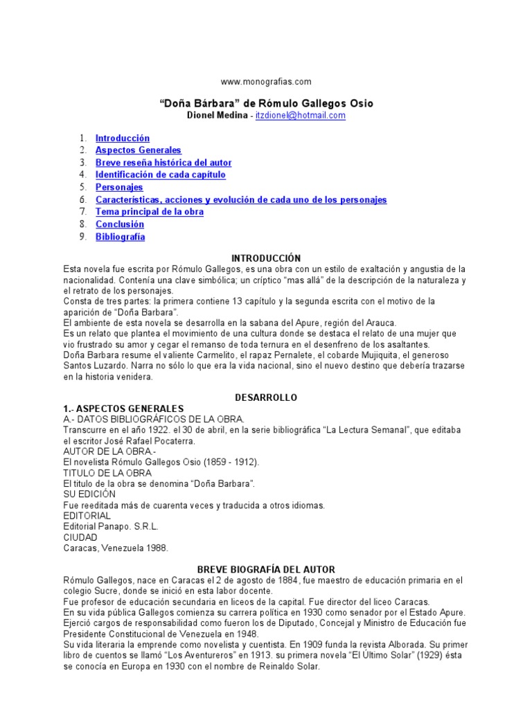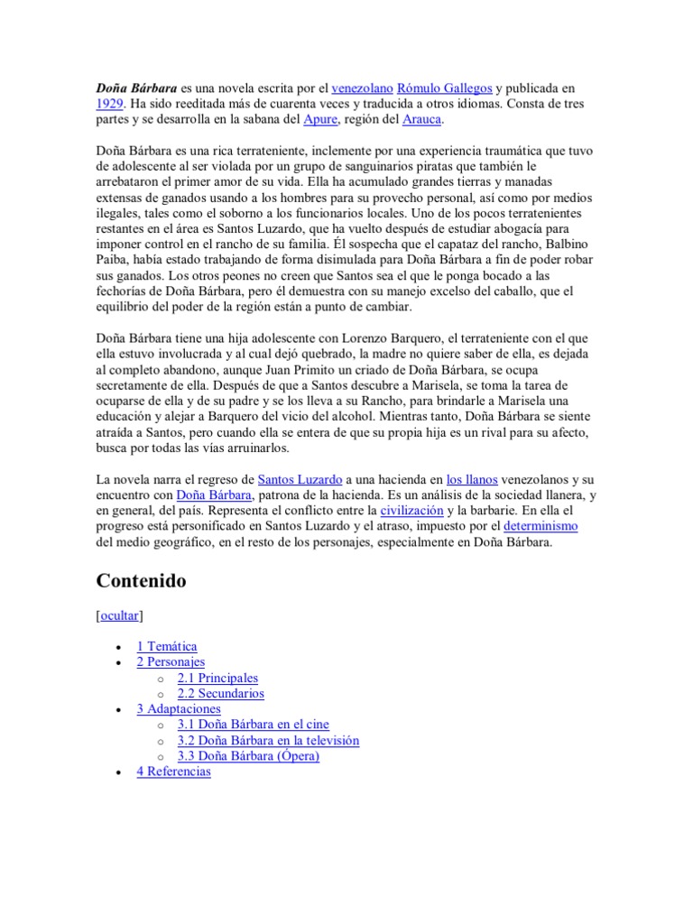 Ella está considerada como la mujer más hermosa de Venezuela además de ser la dueña de la hacienda. Escritor y político venezolano. Resumen de la novela Doña Bárbara Argumento.