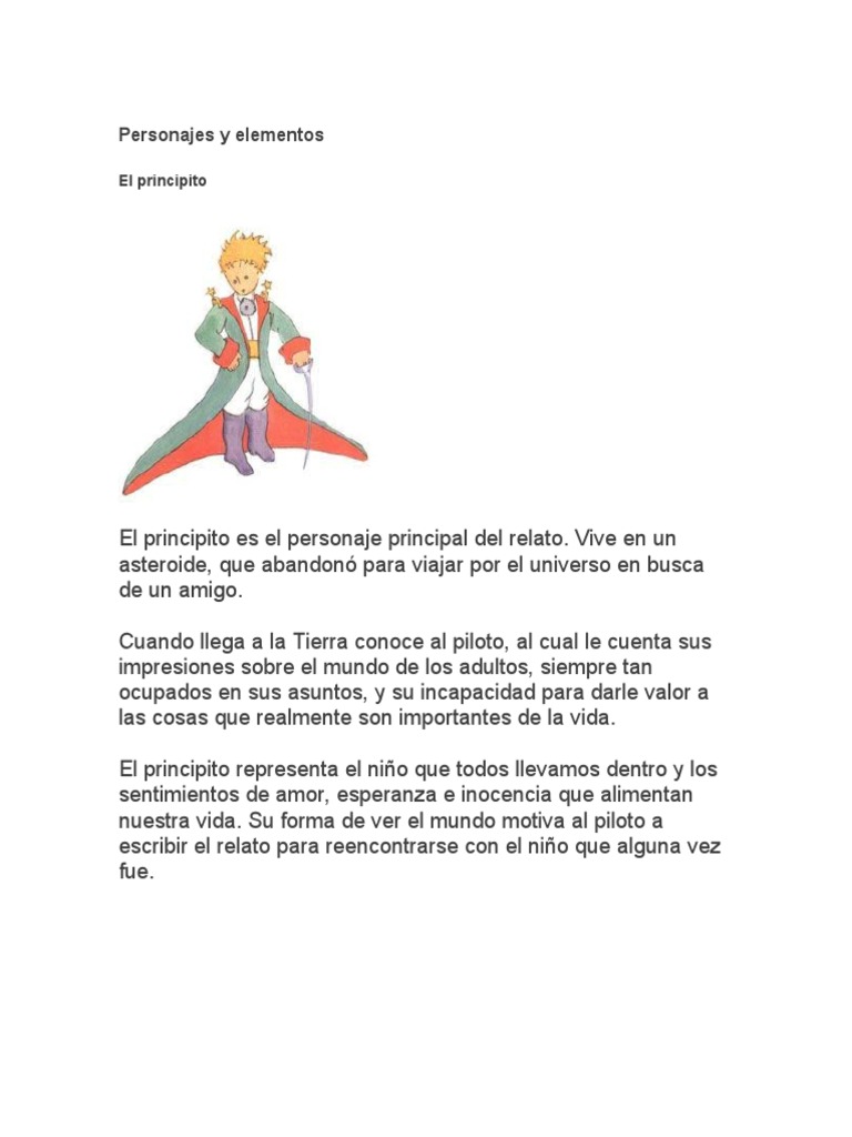 Es el personaje principal del libro. Como todos los niños el Principito era muy ingenuo imaginativo feliz y muchas veces distraído. En principio deberás leer El Principito es un libro sencillo corto y lleno de ilustracionesEs necesario que tomes apuntes y hagas anotaciones mientras lo lees.